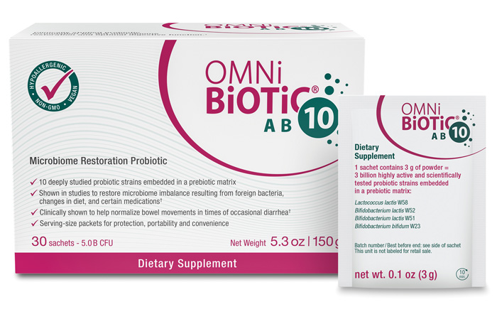 Omni-Biotic AB 10 was designed to restore the gut microbiome from imbalance resulting from antibiotic use, infection, travel, SIBO and other conditions. With proven anti-bacterial/fungal characteristics, AB 10 clinical studies demonstrate mitigation of multidrug resistant gram-negative bacteria, elimination of recurrent C. diff and significant reduction of antibiotic associated diarrhea. Case study success stories with AB 10 have also shown efficacy in IBS (irritable bowel syndrome), Lyme disease, bacterial vaginosis, oral thrush and more.