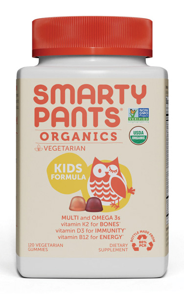 SmartyPants Organic Kids vitamins are USDA (U.S. Department of Agriculture) Certified Organic, Non-GMO (genetically modified organism) Project Verified, vegetarian kids organic multivitamins with over 12 nutrients and omega-3 from organic flaxseed oil to support whole body health, all in one delicious formula kids love.*