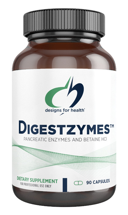 Digestzymes is comprised of a proprietary blend of digestive enzymes along with betaine hydrochloride (HCl) to support the optimal digestion of proteins, fats and carbohydrates. This product contains the special protease dipeptidyl peptidase IV (IVDPP), which aids in the breakdown of the peptides gluteomorphin (from gluten) and casomorphin (from casein). Digestzymes also includes the enzyme lactase, which helps break down the dairy sugar, lactose. The use of Digestzymes before meals may be helpful for patients who experience gas and bloating after eating, occasional constipation or a feeling of fullness after eating only a small quantity of food.